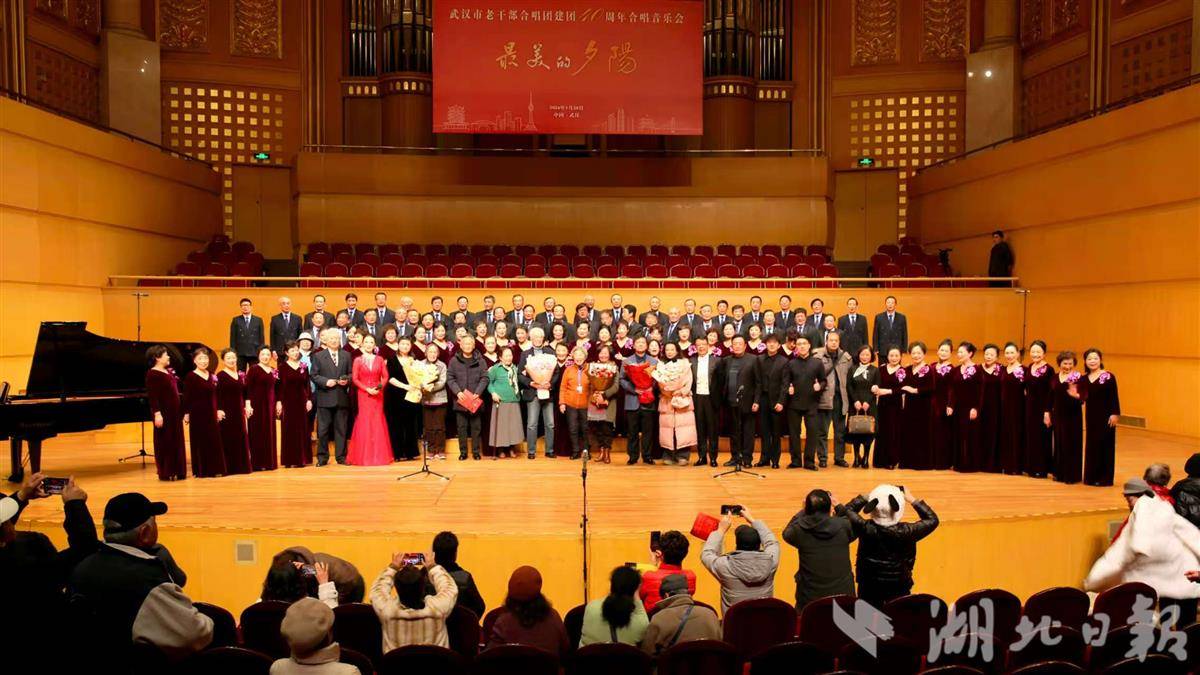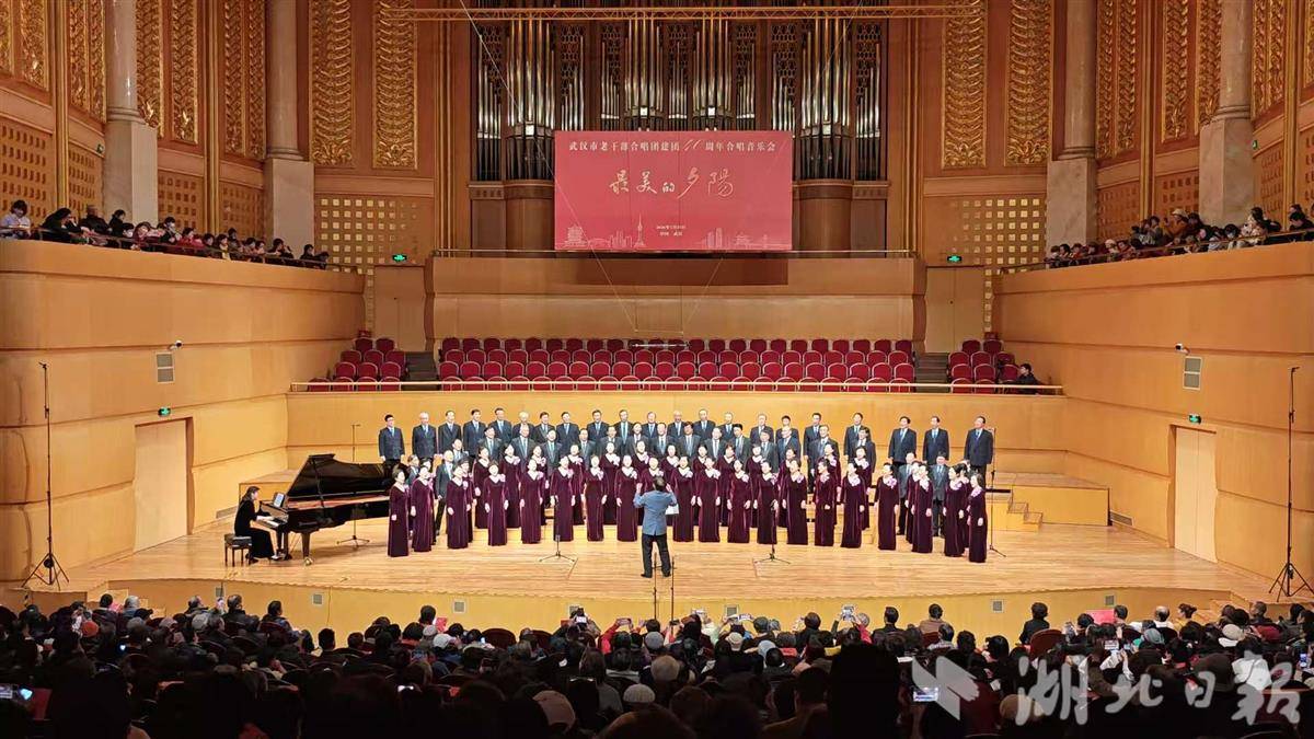 湖北日报讯(记者农新瑜、通讯员韦绪华、范泽生)1月28日晚,武汉琴台音乐厅内歌声悠扬、掌声不断,“最美的夕阳”——武汉市老干部合唱团建团40周年合唱音乐会在此精彩上演。湖北省、武汉市音乐界、合唱界的嘉宾,武汉音协合唱艺委会所属各合唱团的代表与市民近千人聆听了这场高水平的音乐会。