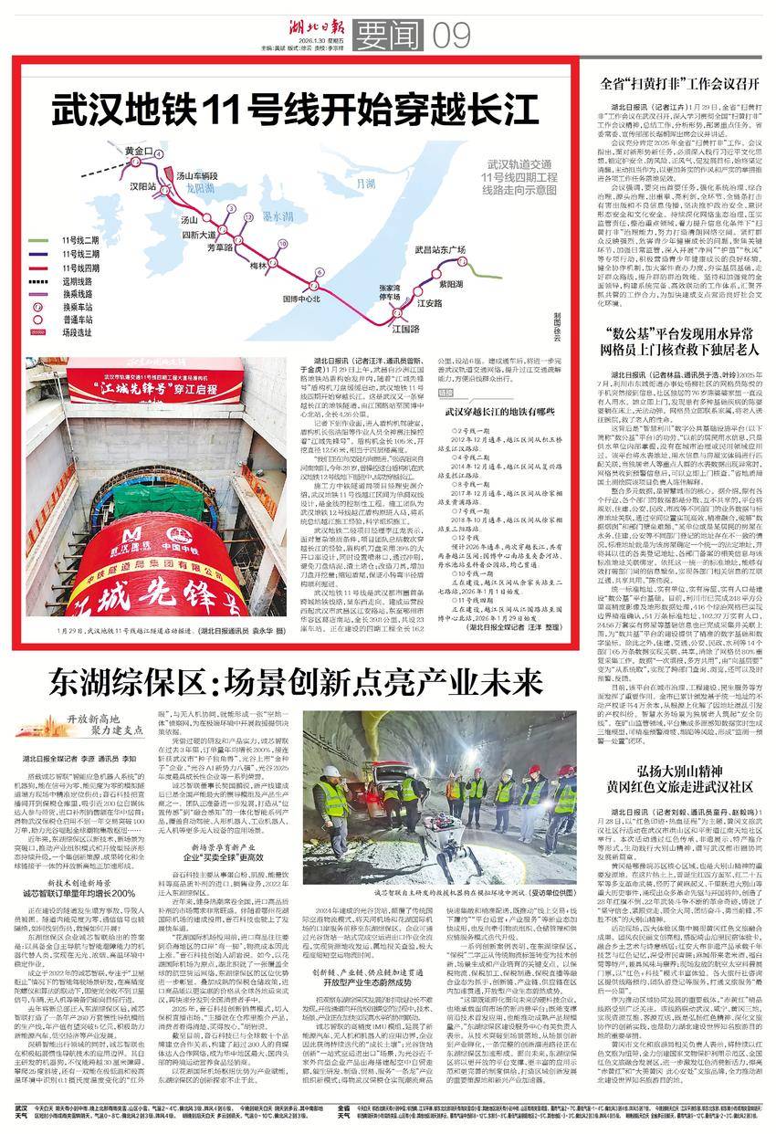 1月30日,湖北日报要闻版头条报道:武汉地铁11号线开始穿越长江