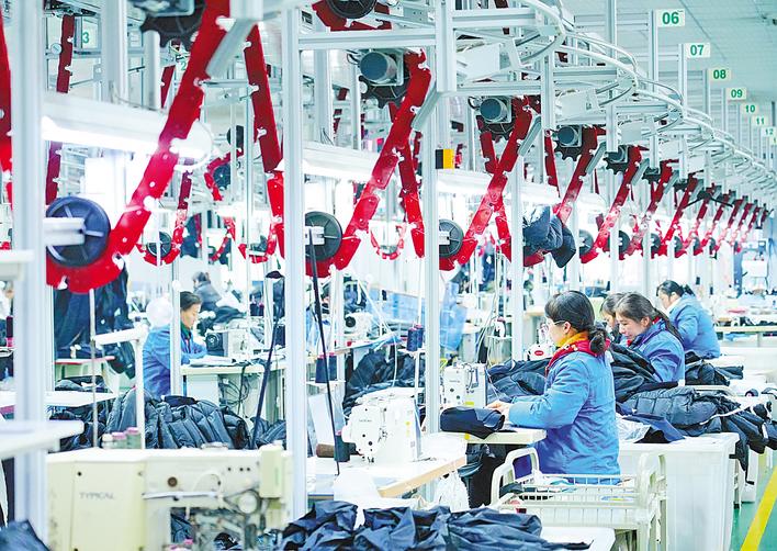 1月27日,在潜江比帆制衣的智能车间里,智能吊挂系统无声穿梭,千余台先进设备与工人默契协作,一件件高端户外服装快速成型。