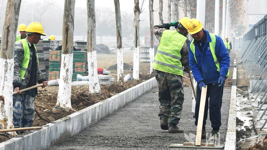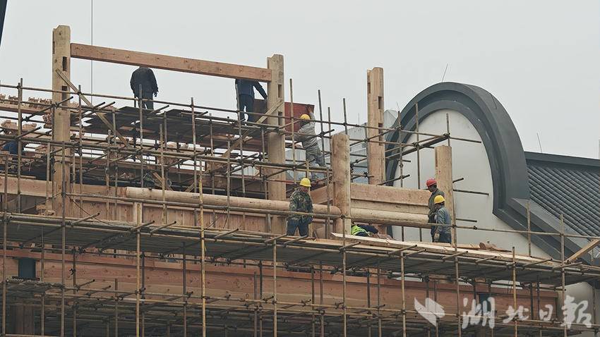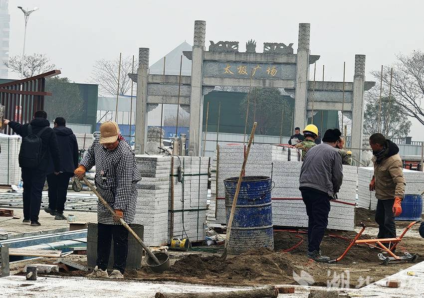 湖北日报讯(通讯员许光泽、袁树林)1月28日,丹江口市右岸春潮涌动,一路相隔的均州老街文旅提升改造项目与桃花源公园建设工地,同步呈现出热火朝天的施工景象。均州老街施工现场,数百名建设者冒着严寒奋战一线,或安装粗大的原木梁架及配套配件,或进行太极广场地面铺装、音乐喷泉设备安装、水榭景观打造、文创IP建设及停车场完善等各项作业;桃花源公园工地内,挖掘机长臂挥舞、高效转运土方砂石,工人们在薄雾里有序施工,或修建景观步道,或移栽绿化苗木,两大工地各工序衔接顺畅、稳步推进。