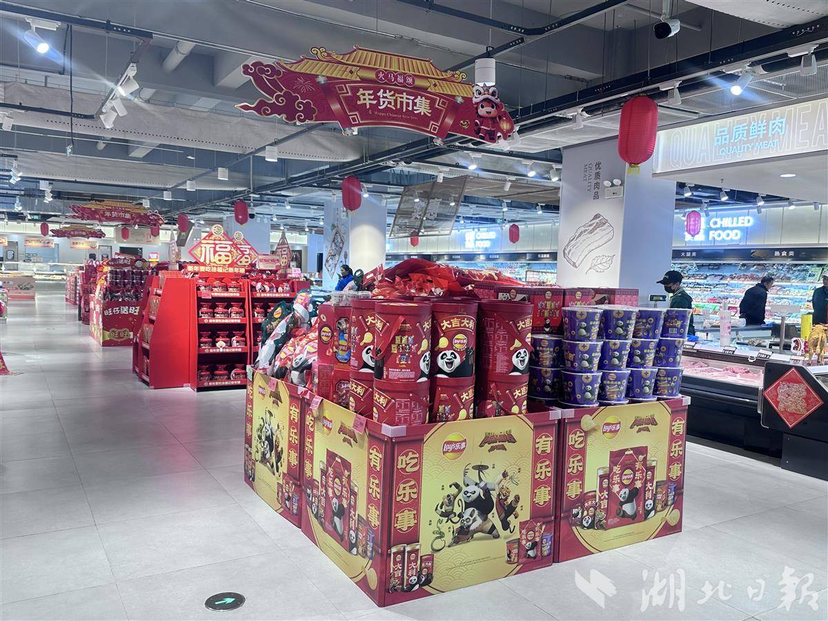 二楼保留社区超市核心业态,主打“小而精、新鲜实惠”。正值新春采购季,超市内年货琳琅满目,老人们推着购物车认真挑选。货架上,湖北本地农产品、全国老字号一应俱全,周黑鸭联名大礼包年味十足;贴合居民健康饮食需求,低糖健康年货专区的低GI饼干、沙琪玛等,年轻人喜爱的国潮巧克力、联名曲奇等新潮好物也应有尽有,兼顾不同年龄层的消费喜好。
