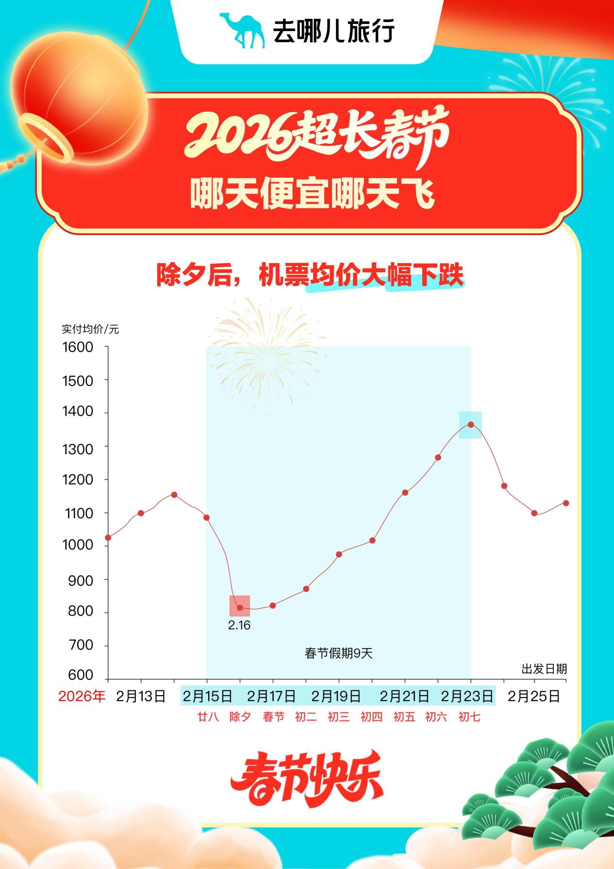 节前出行高峰提前显现。数据显示,2月13日至14日成为节前出行小高峰,这两日出发的机票预订量环比前两日增长15%。进入2月9日,机票预订量逐日递增,2月14日达到春节前峰值。机票价格随出行量变化,2月15日起回落,2月16日降至节日最低点,2月17日至19日价格也较划算,不少旅客选择节中出行,目前,此期间机票预订量同比去年增长三成。