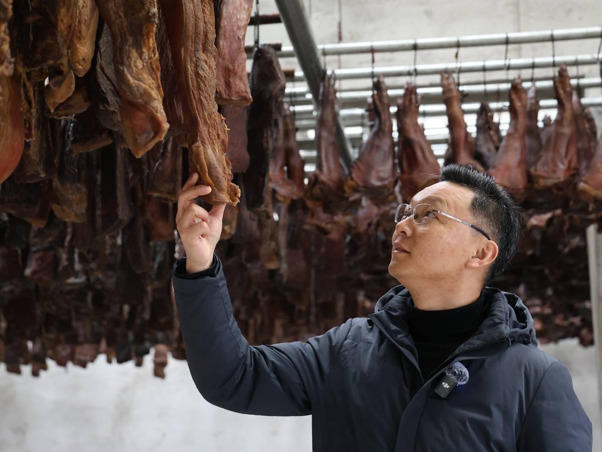 方国栋在检查腊味质量。(湖北日报全媒记者刘毅摄)