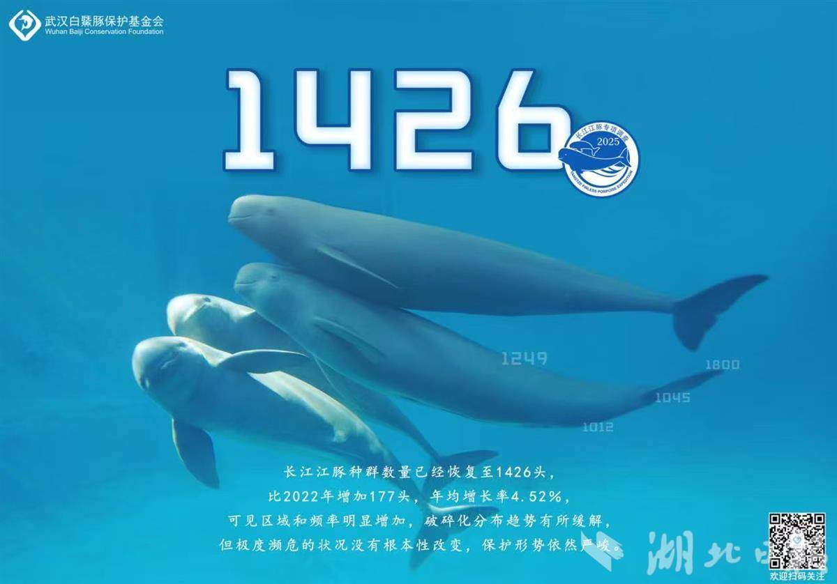 湖北日报讯(通讯员周硕)1月30日,国新办发布会传来振奋人心的消息,2025年长江江豚专项调查结果显示,其种群数量已恢复至1426头,较2022年增加177头。作为长江江豚的重要栖息地,湖北在长江十年禁渔推进过程中持续发力,为这一“水中大熊猫”的繁衍生息筑牢了生态屏障。
