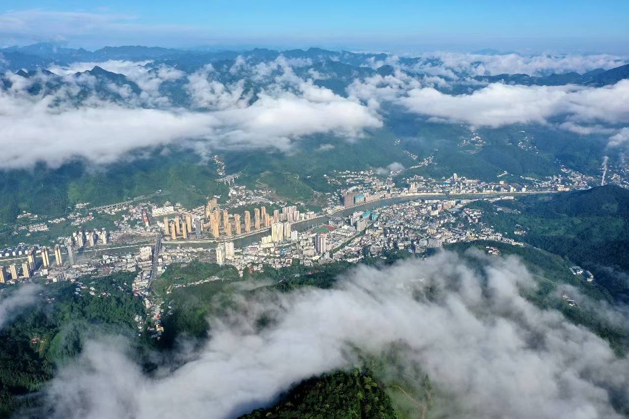 从空中俯瞰保康县城,青山环绕、白云掩映。(湖北日报通讯员 杨韬 摄)