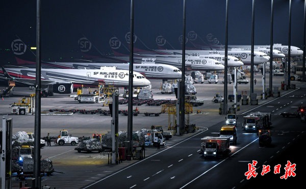 凌晨的花湖机场灯火通明,停机坪上一片繁忙景象。长江日报记者史伟 摄