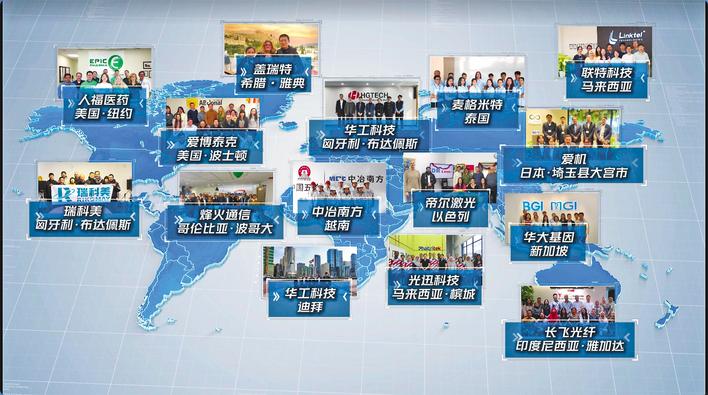 大会一开场,华工科技从匈牙利布达佩斯、烽火通信从哥伦比亚波哥大、人福医药从美国纽约、长飞光纤从印度尼西亚雅加达……15家光谷企业从其全球各地分支机构发来祝福,像极了“春晚”全球华人拜年的热闹景象。
