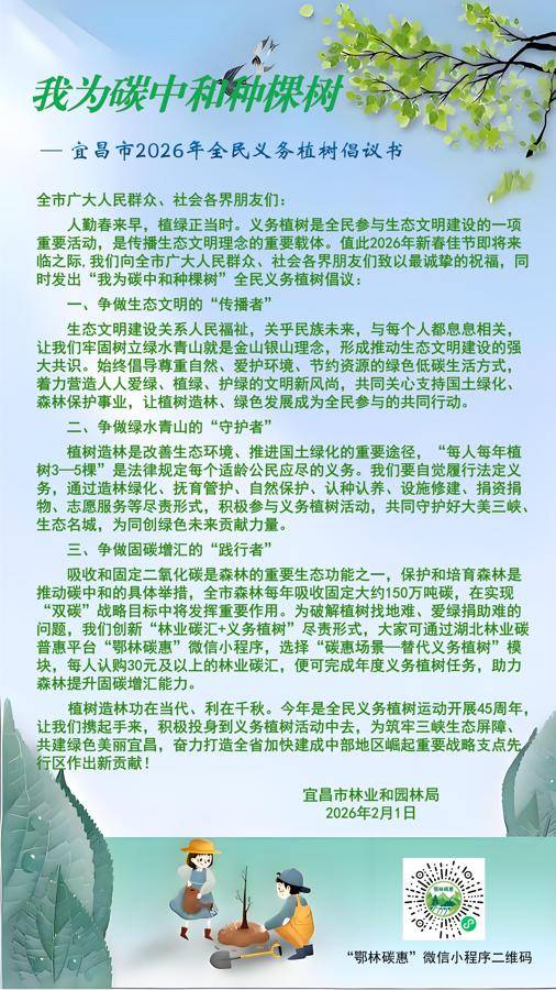 湖北日报讯(记者万雷萌、通讯员隗权)时近立春,植绿正当时。2月1日,宜昌市林业和园林局发出“我为碳中和种棵树”2026年全民义务植树倡议,号召社会各界以多种形式履行植树义务,共同为筑牢三峡生态屏障、建设绿色美丽宜昌贡献力量。今年恰逢全民义务植树运动开展45周年,此次倡议鼓励公众通过线上线下多种渠道参与国土绿化。