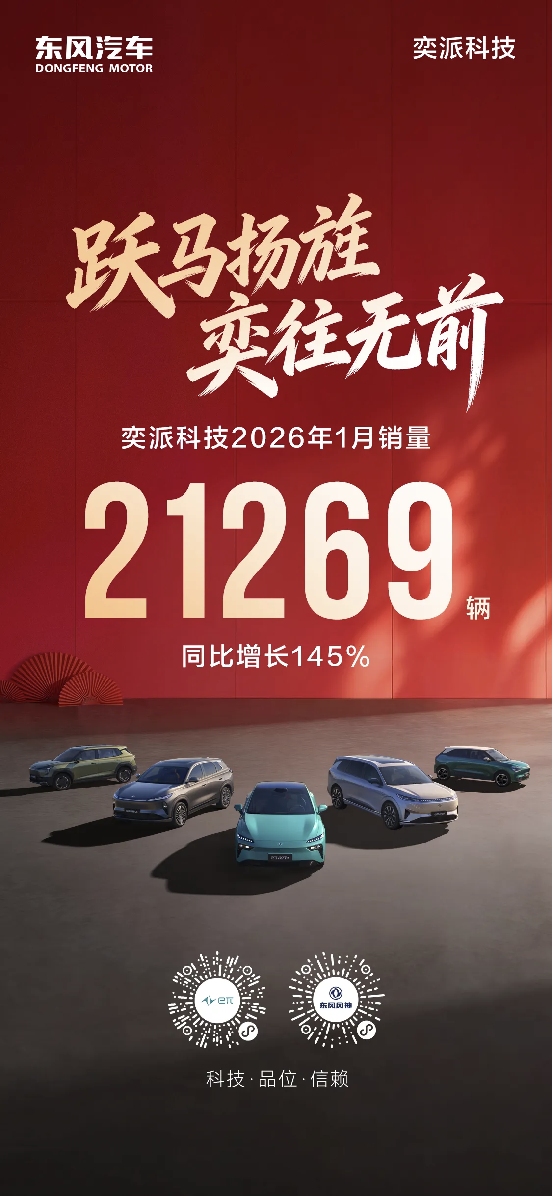 湖北日报讯(记者左晨、实习生肖卿)2月1日,东风奕派汽车科技公司(以下简称“奕派科技”)发布销量数据:2026年1月销量21269辆,同比增长145%,赢得新年“开门红”。据悉,奕派科技旗下的东风奕派和东风风神品牌,2026年计划投放5款全新车型,支撑东风自主新能源事业高质量发展。