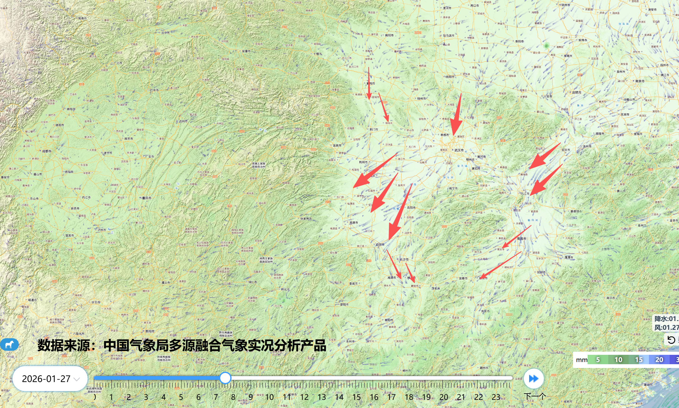 自1月23日开始,受区域扩散条件不利及本地排放叠加影响,多地PM2.5浓度持续升高;1月24日夜间至26日白天,在东北风持续作用下,上游污染主体经襄阳、随州、孝感等地输送进入我省,荆州、荆门、随州均出现小时重度污染,其中荆州出现了持续6个小时重度污染,峰值浓度达163微克/立方米;1月27-28日,省内逐步由北风转为偏东风,污染气团滞留,“襄荆荆宜十”持续污染态势,东部逐步改善。29日之后在大风和降水的共同作用下,全省空气质量逐步改善。