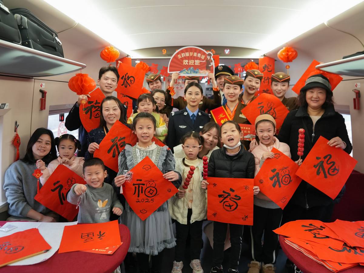 2025年春运,复兴号上,中国铁路武汉局集团有限公司襄阳客运段乘务员与旅客一起写“福”送“福”。通讯员 左一琪 摄