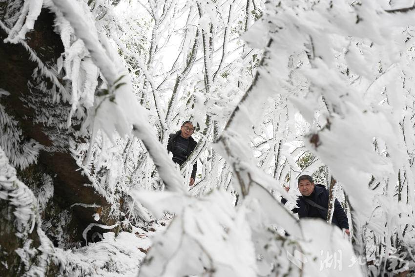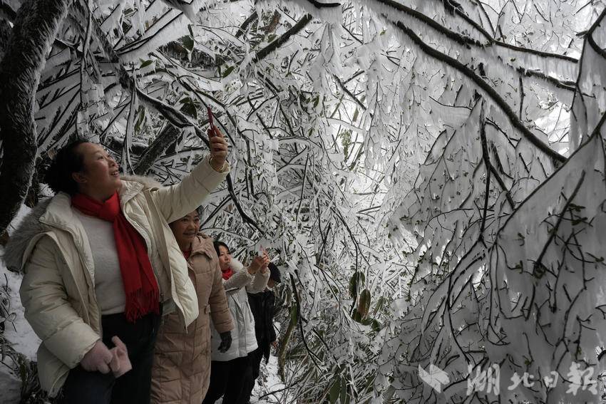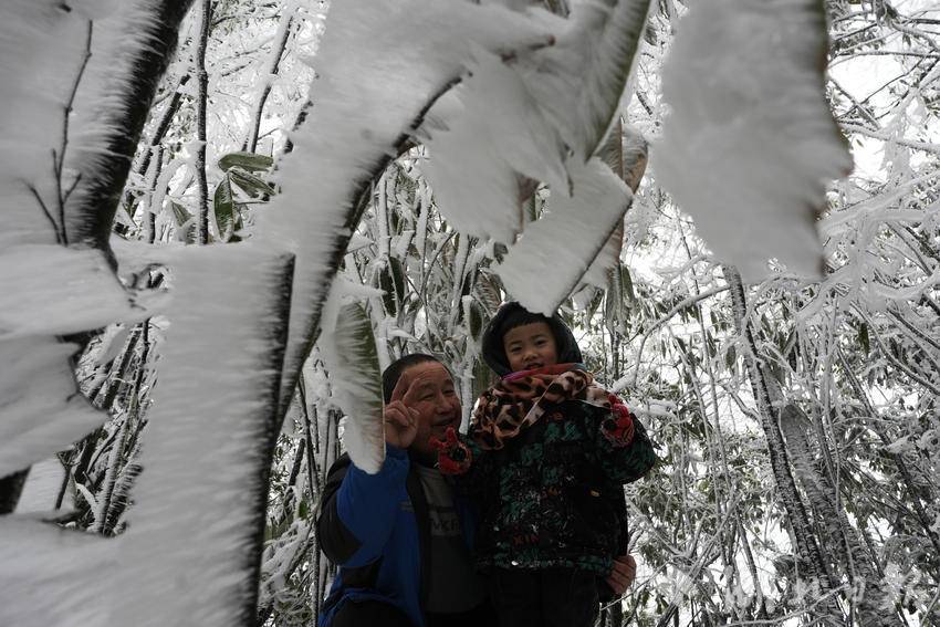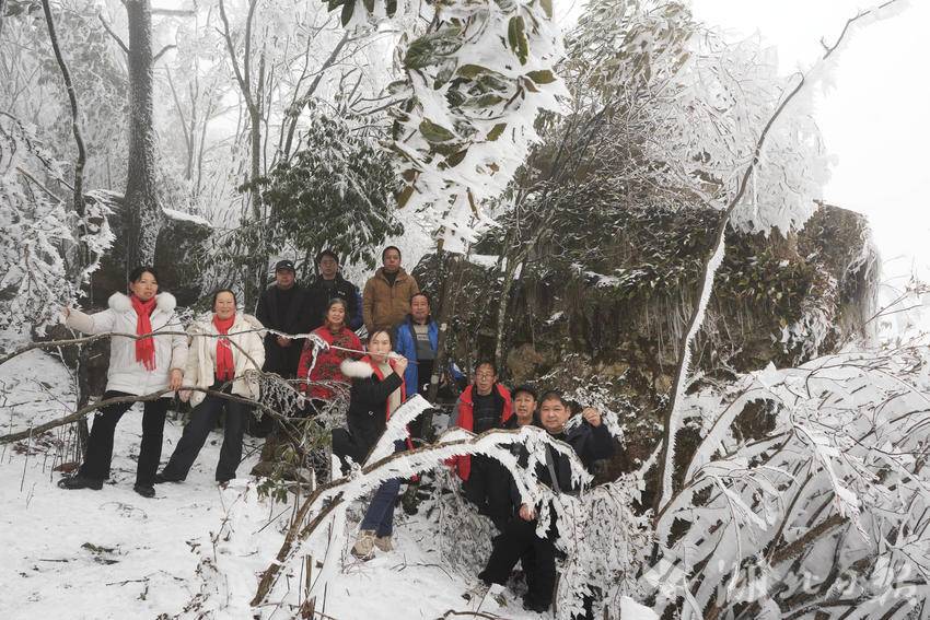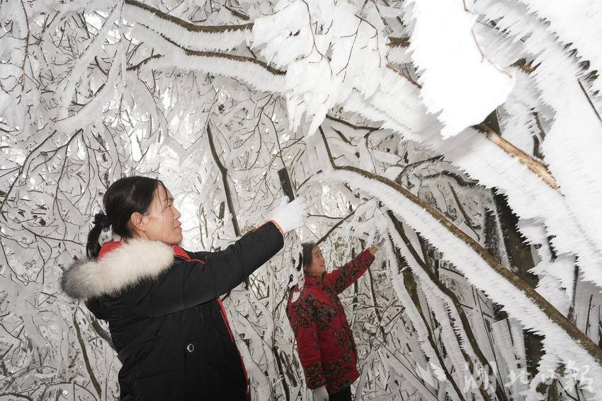 当地游客在咸丰县黄金洞乡水杉坪村四方梁观赏雾凇。(湖北日报客户端通讯员 李维君 摄)