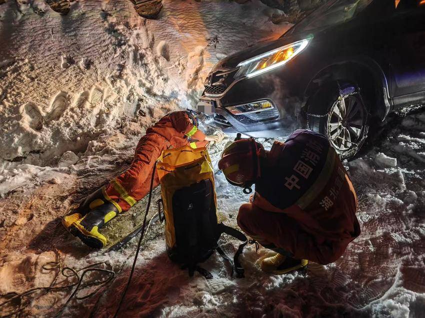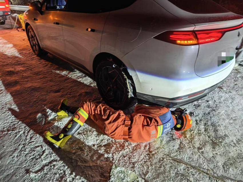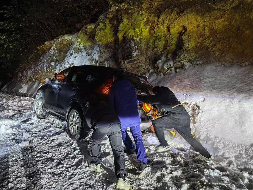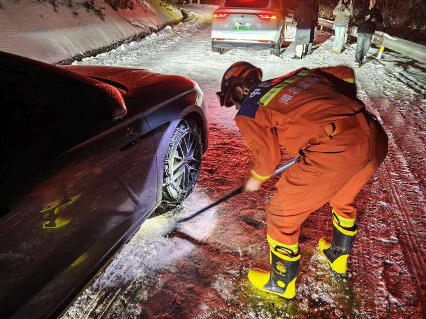 前往救援途中,消防员发现一辆车辆因打滑横停路中,立即设置警示标识并合力推正。随后将一辆失控冲入沟中的私家车牵引救出,并推至安全地带。此外,途中遇到三辆从外地前往昭君原野滑雪的车辆,在陡坡路段因雪地打滑无法前行,消防员现场为其安装防滑链,并驾车引路护送,直至安全抵达目的地。