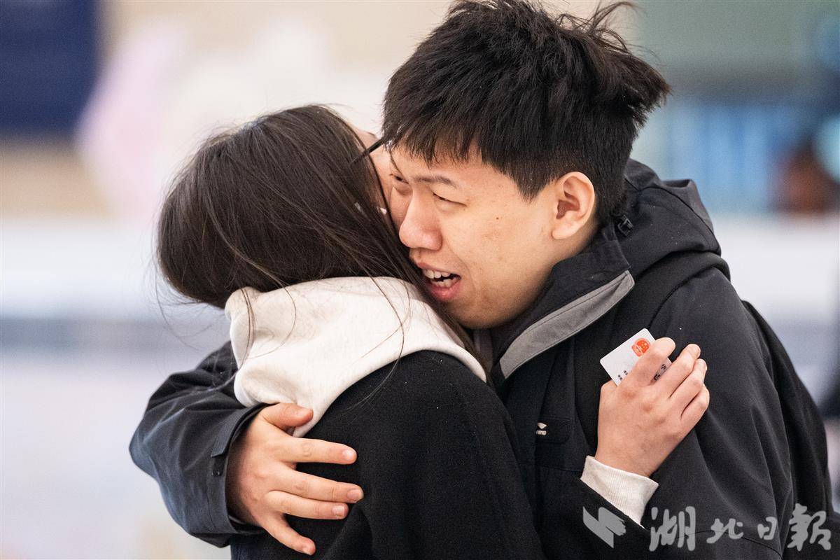 2月2日,在汉口火车站,一对男女在汉口火车站内拥抱分别。(湖北日报全媒记者 任勇 通讯员 宋萍 邱晟 摄)
