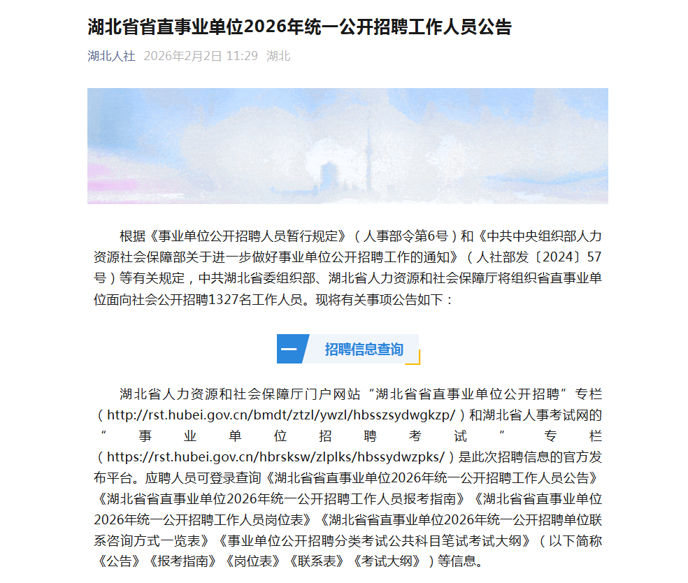 湖北日报讯(记者王成龙)2月2日,《湖北省省直事业单位2026年统一公开招聘工作人员公告》发布。公告显示,省委组织部、省人力资源和社会保障厅将组织省直事业单位面向社会公开招聘1327名工作人员。