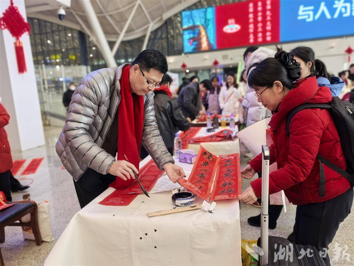 准备前往山西的郑女士小心翼翼接过墨迹未干的春联,脸上笑意漾开:“车还没开,年味儿已经扑鼻而来。武汉站这份用心,让人暖到心里!”