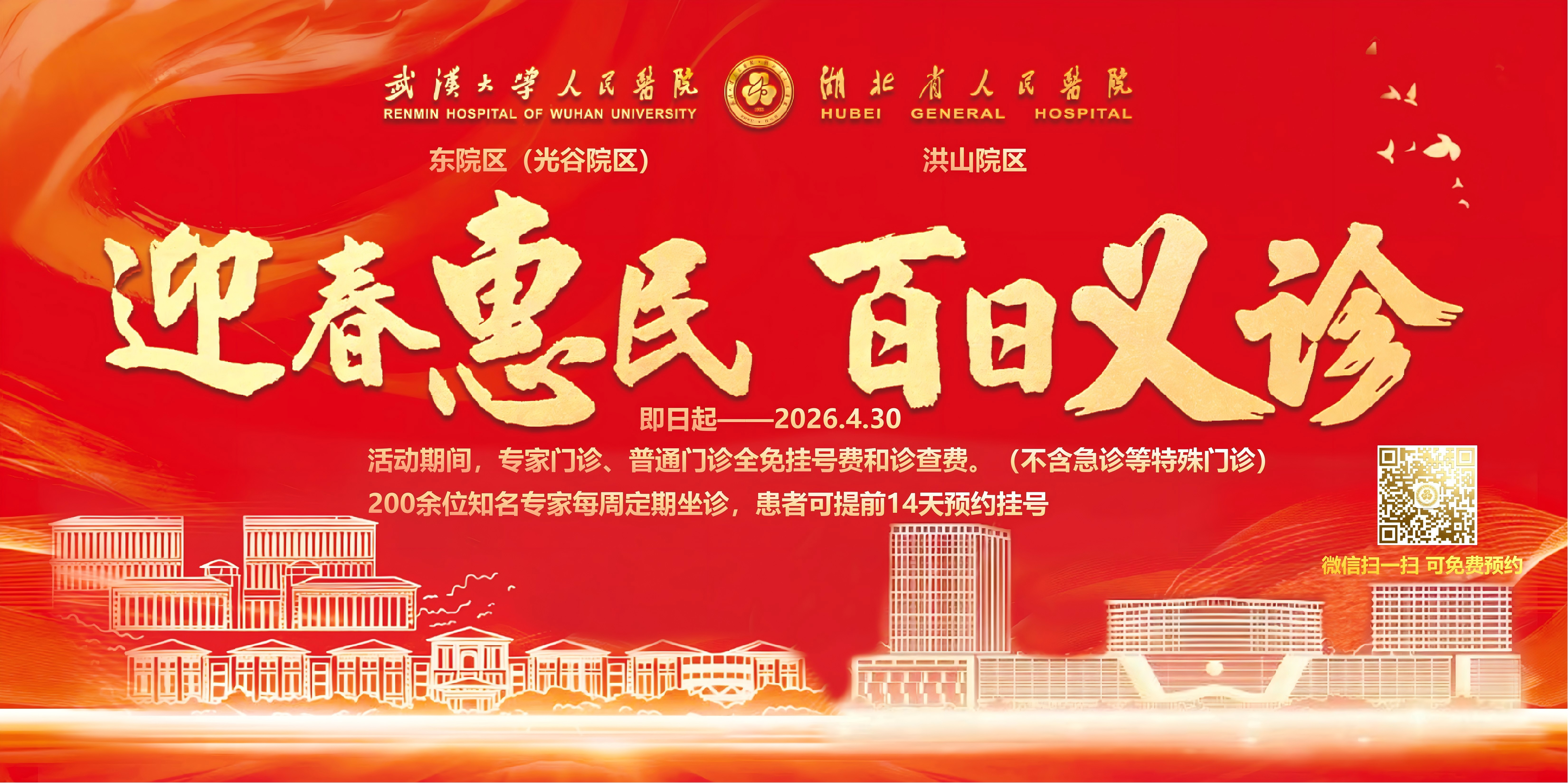 湖北日报讯(记者曾莉、通讯员李苇薇)即日起至今年4月30日,武汉大学人民医院(湖北省人民医院)将在东院区、洪山院区同步开展“迎春惠民·百日义诊”活动,为期100天。活动期间,200余名资深专家固定坐诊,患者可享受免收挂号费及诊查费的惠民服务,在家门口就能便捷享受高质量诊疗。