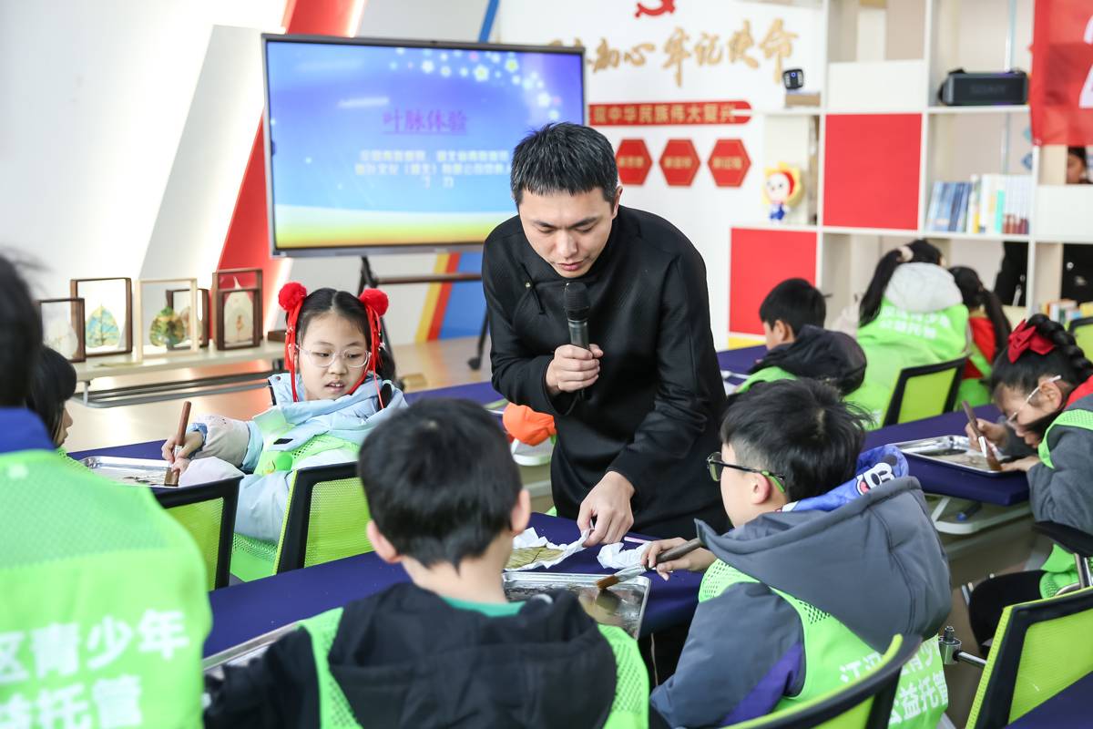 活动中,全国青联委员、湖北省青联常委陈超为孩子们讲授了一节充满欢声笑语的互动趣味课堂。通过“你比划我猜”“故事接龙”等游戏,孩子们在轻松愉快的氛围中感受到陪伴的温暖与语言表达的乐趣。全国青联文化艺术界别副秘书长、湖北省青联委员刘正心则向孩子们讲解了中国传统服饰文化,并指导他们体验汉服,在互动中领略中华优秀传统文化。全国青联委员、湖北省青联委员丁力带领孩子们进入叶脉的世界,以“实物展示+步骤演示”的方式,生动讲解了叶脉制作技艺。孩子们分组动手实践,亲身感受非遗传承的独特魅力。