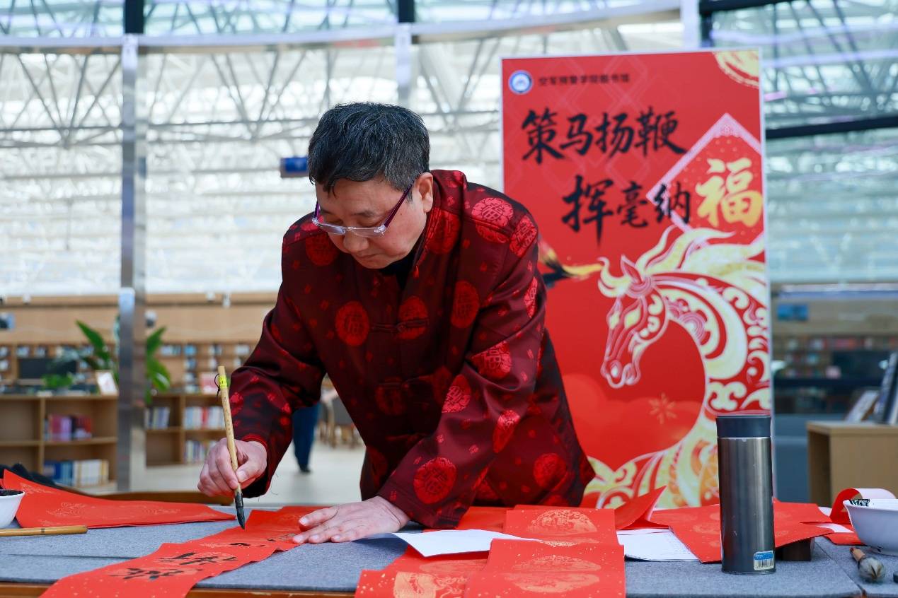 近日,武汉市百步亭书法协会的老同志们走进空军预警学院图书馆,与学员们开展“讲传统、话强军、扬国学”文化进军营活动,以写春联、绘福字、剪窗花、拓年画的形式,献上一场年味与墨香兼具的文化雅集。