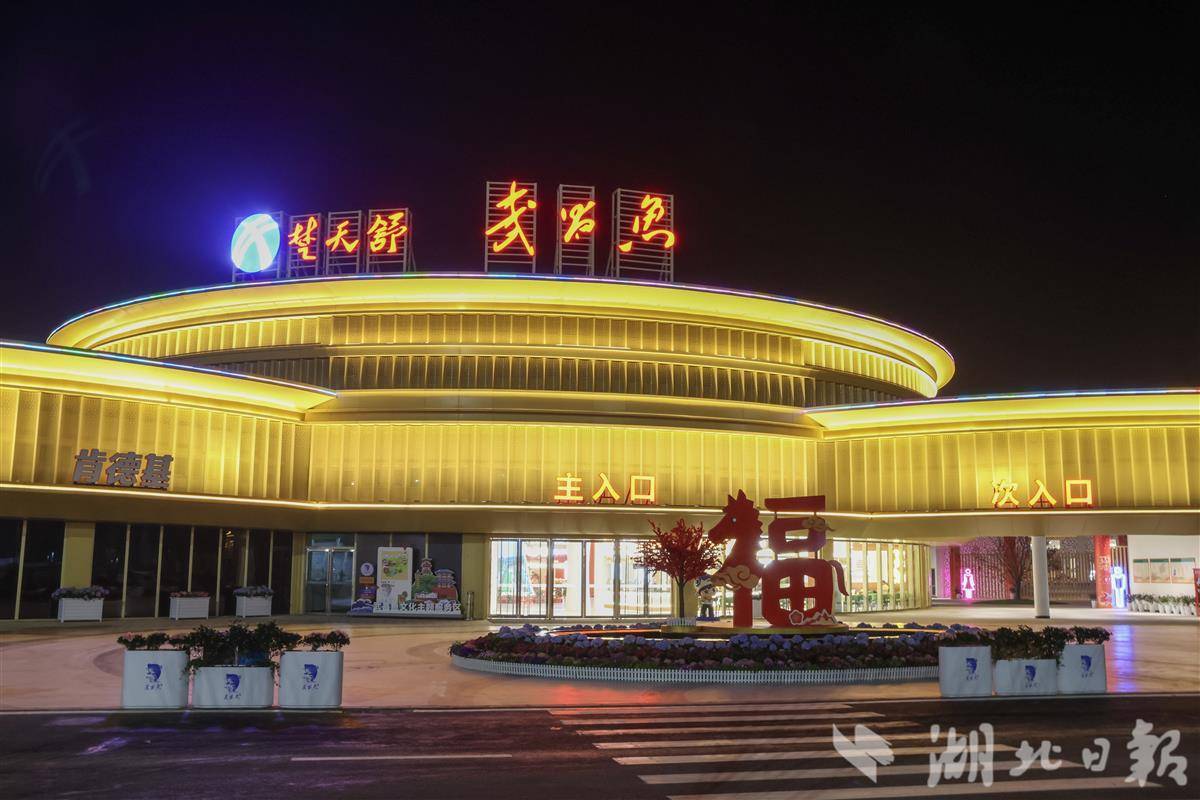 中建三局相关负责人介绍,服务区以“鱼米之乡”为设计主线,通过圆形建筑形态和采光中庭,呈现“鱼戏莲叶间”的灵动景致,整个区域被打造成一个荆楚江湖市集,悬挂的红灯笼和中国结营造出浓厚的烟火气。