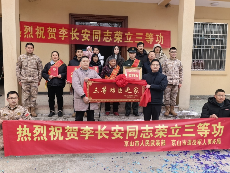 湖北日报讯(记者王孝武、通讯员袁巍、实习生邱瀚锦)春节前夕,荆门京山市退役军人事务局联合该市人武部、绿林镇政府,冒着严寒与风雪,奔赴绿林镇高枧村,为荣立三等功的现役军人李长安家庭送去喜报及慰问金,李长安所在部队领导也专程赶来,共同见证这份属于军人与军属的荣耀时刻。