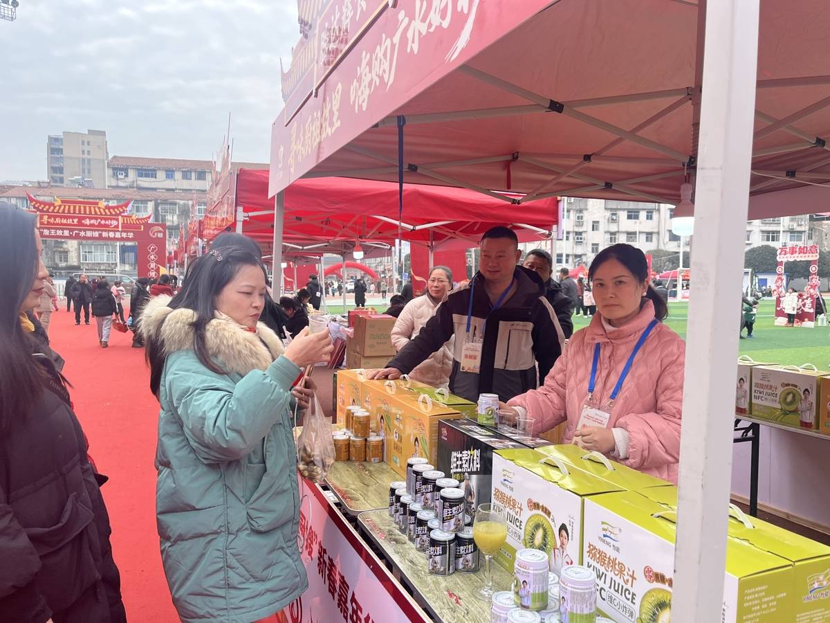 除了传统年货外,本地新品也备受青睐。腾达辉食品(湖北)有限责任公司带来的猕猴桃现榨饮品刚一亮相,就受到大批消费者的喜爱。“一上午就卖了2000多单,很受消费者欢迎。”公司负责人李波难掩兴奋。