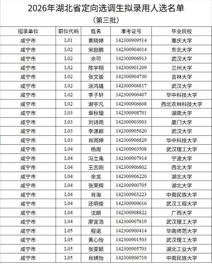 湖北日报讯(记者雷巍巍)2月2日,湖北省委组织部发布公告,根据《2026年湖北省定向选调生招录公告》,综合考试、考察和体检等情况,现将第三批拟录用人选名单予以公示。公示时间为5个工作日。如对公示名单有异议,可向相关招录单位反映。其他单位拟录用人选名单待确定后公示。