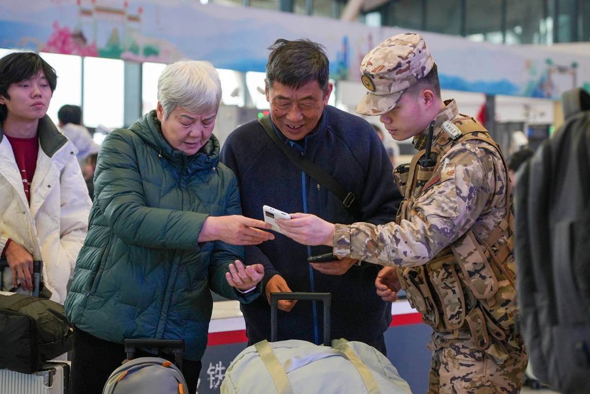 执勤官兵在武汉站站内为旅客答疑解惑。(通讯员 唐彬 摄)