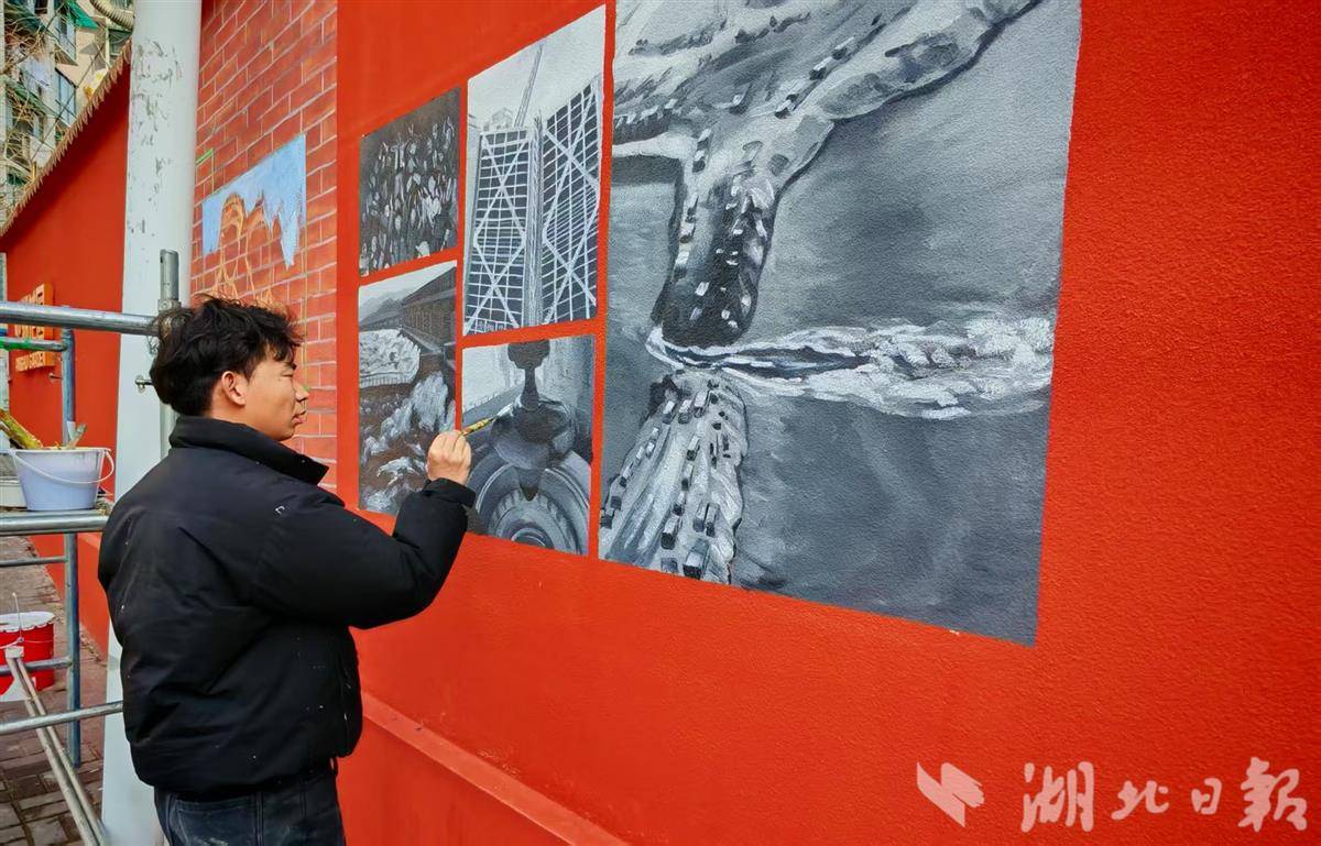 工作人员为刘家大堰社区绘制文化墙。(湖北日报全媒记者戴文辉摄)