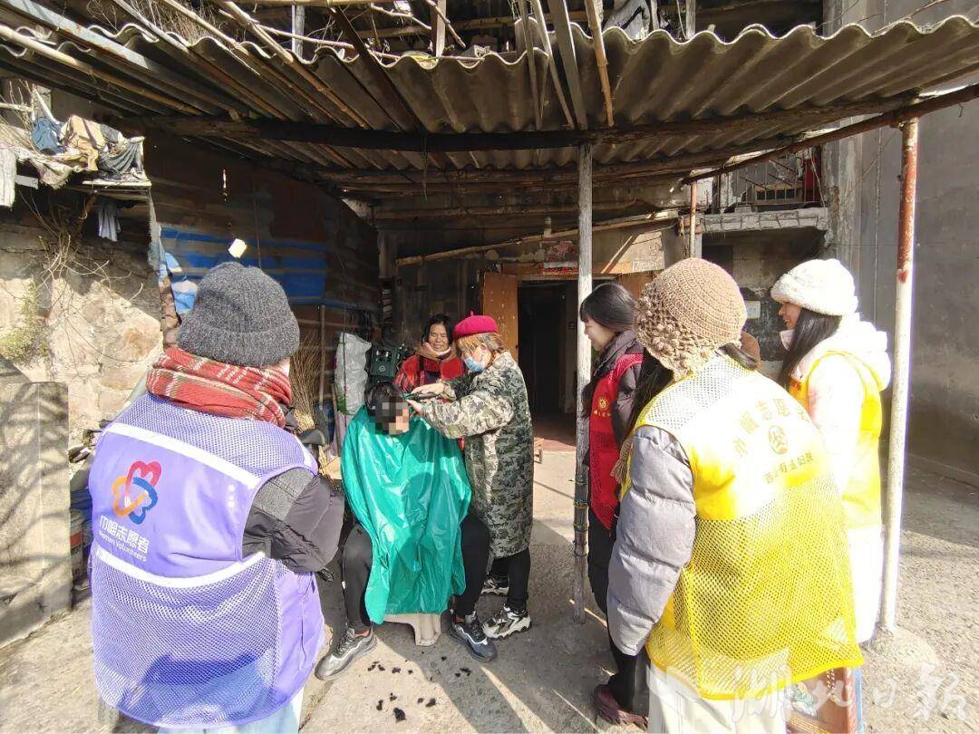 走进蟠山坊小区晓晓(化名)的家中,昏暗的房间里,小姑娘腼腆地躲在奶奶身后,及肩的头发凌乱地贴在脸颊,许久未修剪的发丝遮住了眉眼。爱心妈妈们见状,立刻从随身的志愿包里取出理发剪、木梳与干净的围布,“来,宝贝,咱们剪个清爽的发型,漂漂亮亮过新年呀!”志愿者李大姐温柔地牵过晓晓的手,轻轻为她系好围布。指尖细致梳理每一缕发丝,剪刀在发间轻柔穿梭,“沙沙”声中,原本杂乱的头发渐渐变得整齐利落。晓晓对着镜子瞥了一眼,原本紧绷的嘴角慢慢扬起浅浅笑意,大眼睛里闪烁着羞涩又欢喜的光,小声说了句:“谢谢阿姨。”