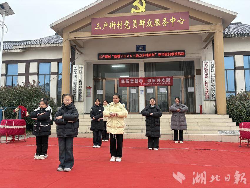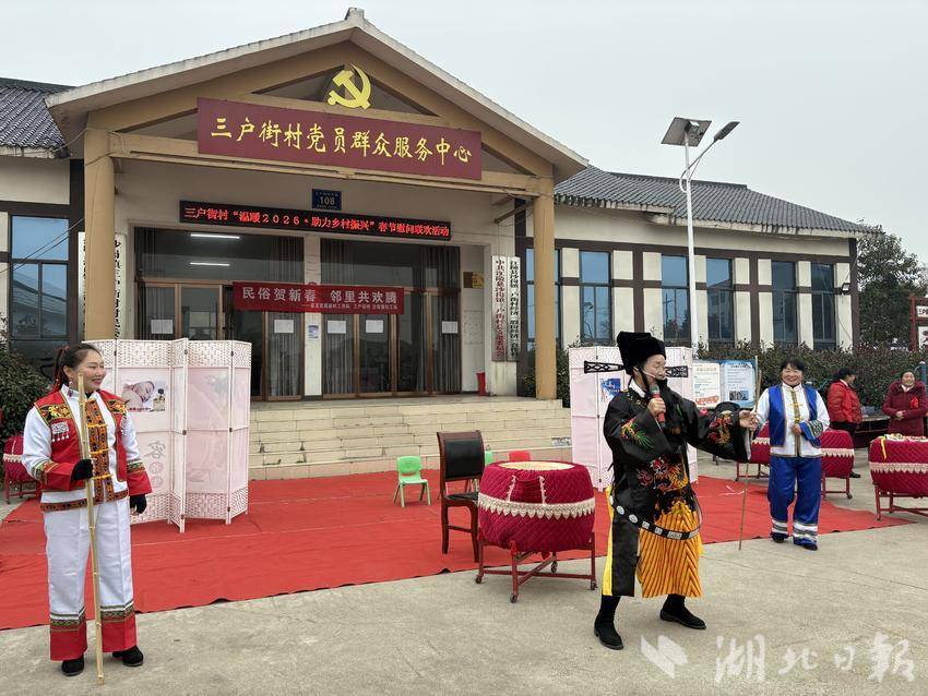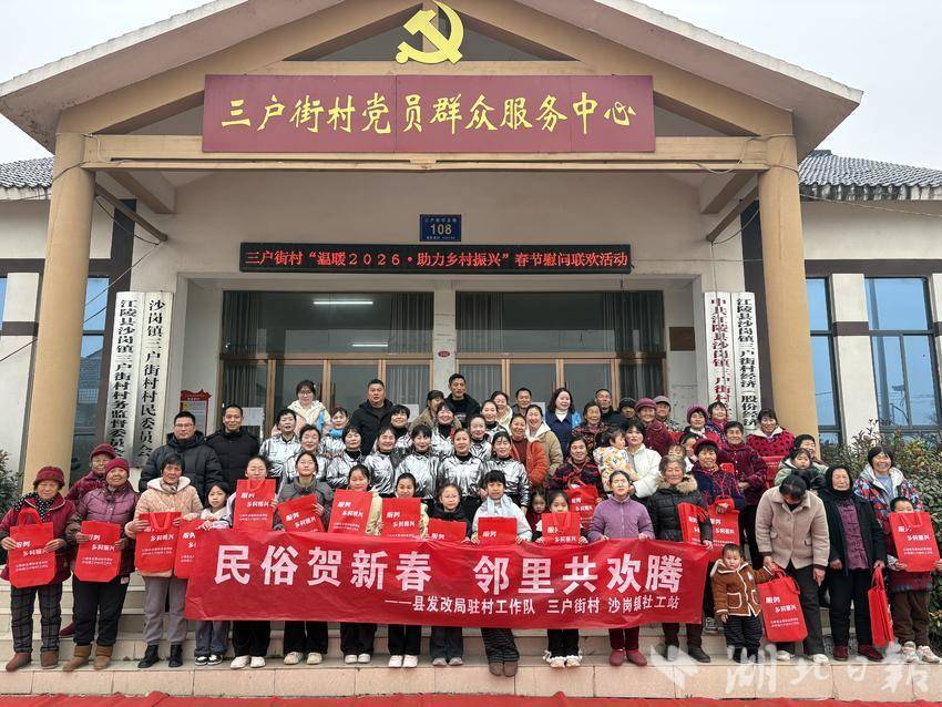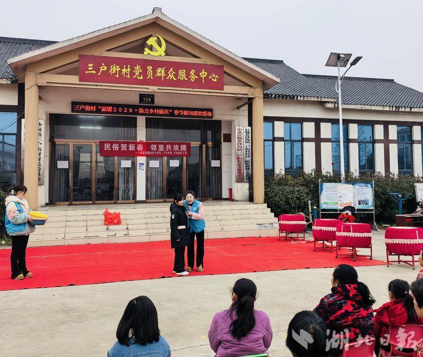 湖北日报讯(通讯员朱玲)2月4日立春当天,江陵县沙岗镇三户街村村委会广场热闹非凡,一场以“民俗贺新春 邻里共欢腾”为主题的联欢会在此举行。此次活动由县委社会工作部、沙岗镇、县发改局等部门指导,微助社工驻沙岗镇社工站联合三户街村党支部共同举办。村支书杨传俊与县发改局驻村组长尹官海登台致辞,为村民送上新春祝福。