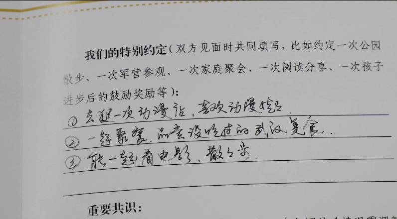 中学生小黄身患残疾,父母离异后,跟着奶奶生活在一起。他在约定上歪歪扭扭地写下“我想有个哥哥教我打篮球”的心愿,结对的张参谋当即承诺:“我家儿子喜欢打球,放假就来陪你!”