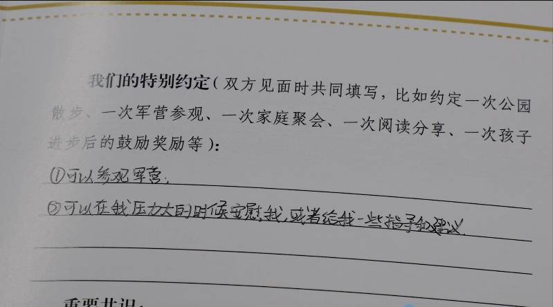 活动现场,结对家庭代表郑重地在《温暖约定》上签字,孩子们在“我们的特别约定”里写下朴素的愿望,军人家庭代表则留下真挚的鼓励与祝福。“想参观军营,看看叔叔们训练的地方”“希望军人叔叔能在我压力大的时候陪陪我”……孩子们的愿望朴实而真挚。