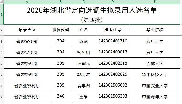 湖北日报讯(记者雷巍巍)2月4日,湖北省委组织部发布公告,根据《2026年湖北省定向选调生招录公告》,综合考试、考察和体检等情况,现将第四批拟录用人选名单予以公示。公示时间为5个工作日。如对公示名单有异议,可向相关招录单位反映。