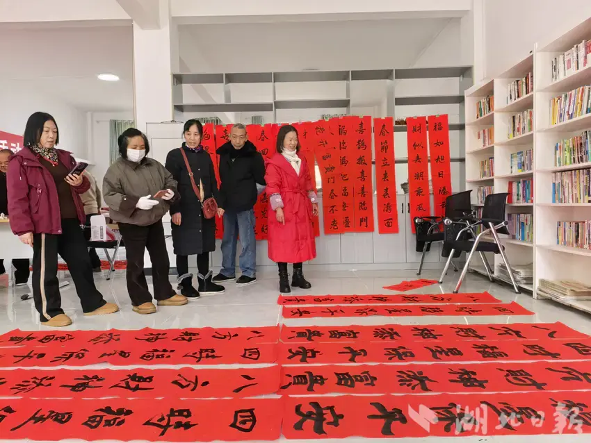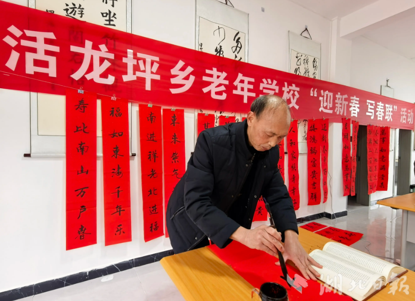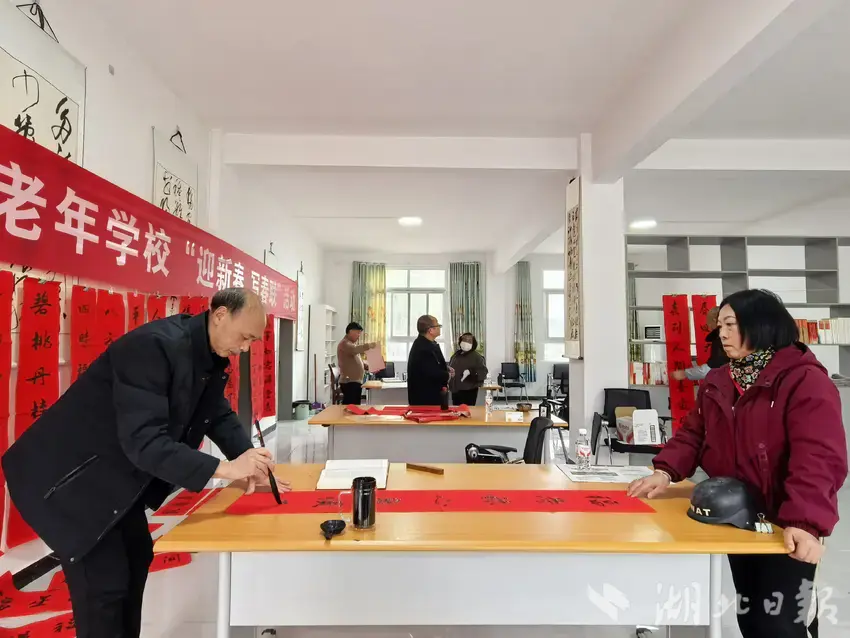 湖北日报客户端讯(通讯员甄亚芳)2月3日上午,咸丰县活龙坪乡老年学校组织学员迎新春,写春联,送祝福。老年学员挥毫泼墨,将新春祝愿倾注于一副副春联之上。他们开展志愿服务,把写好的春联赠送给社区居民,喜迎新春。