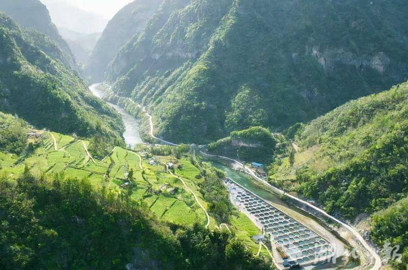 九道乡瓦房坪村地处秦巴山区腹地、神农架北麓,平均海拔超过1200米,为阴峪河流经之地,境内水源清澈纯净、无工业污染,常年水温稳定在虹鳟生长的黄金区间,得天独厚的自然生态条件成为优质冷水鱼养殖的天然宝地。依托这一核心优势,九道乡引进格瑞农业房县鲑谷养殖基地,打造标准化、规模化虹鳟养殖样板,基地建成111个陆基圆池,养殖水体超6400立方米,现存栏虹鳟20万尾,年产量可达300吨,是区域内规模领先的冷水鱼养殖基地。