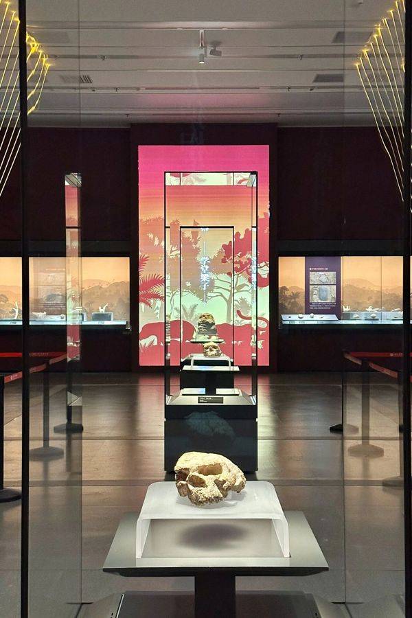 “郧县人”1号、2号头骨化石及3号头骨出土模型在展厅“相聚”(湖北省博物馆供图)