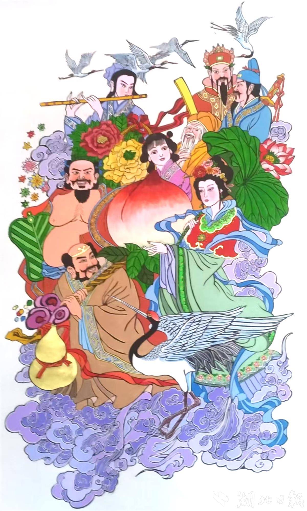 第四类是神话传说类,以民间流传的神话故事、历史典故为题材,兼具观赏性与教化性。《八仙贺寿》描绘八仙过海赴蟠桃宴的场景,既显神话意境,又祝长辈长寿;《嫦娥奔月》《牛郎织女》等题材,将经典传说刻于木版、印于纸上,让传统文化通过年画代代相传。这类年画不仅是装饰,更是百姓了解传统文化的重要途径。