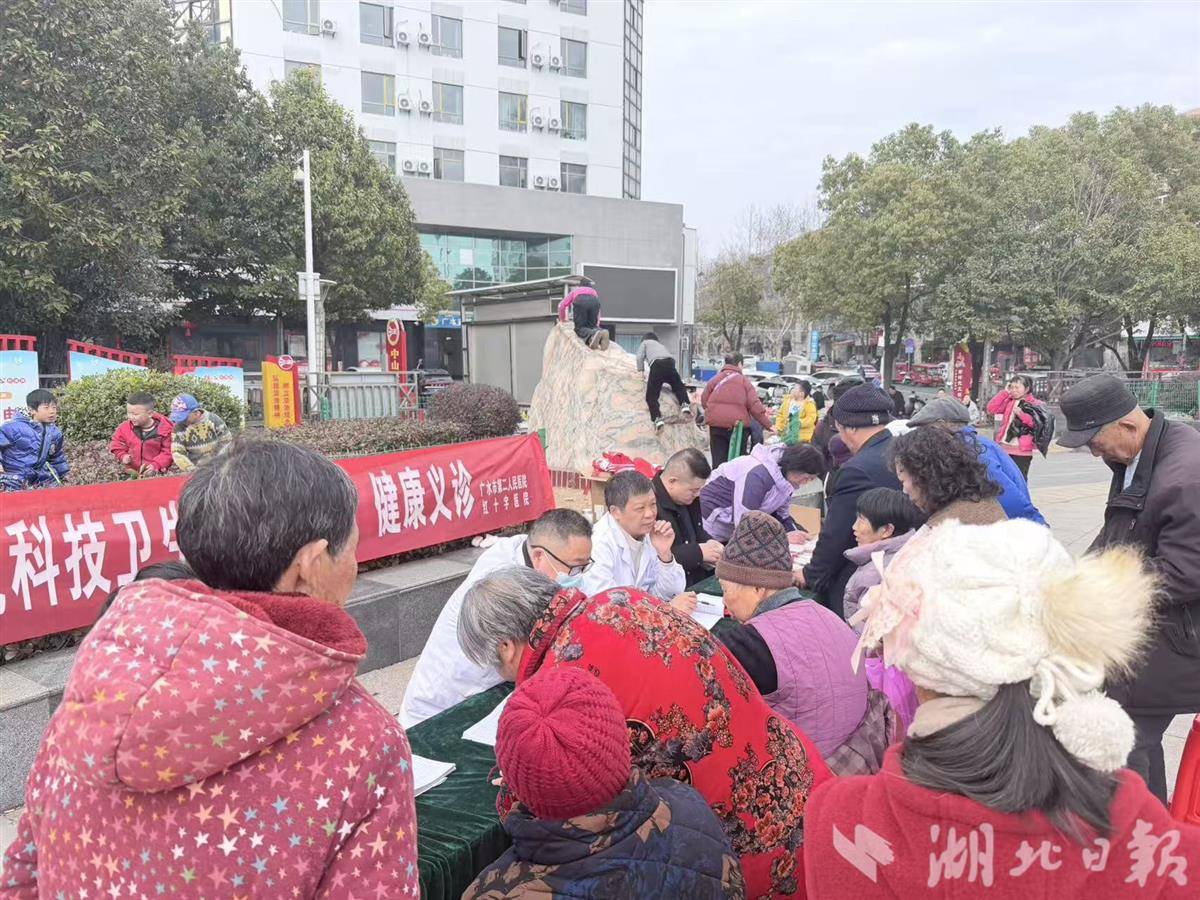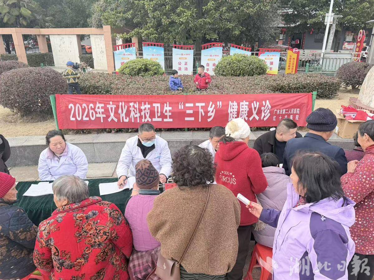 湖北日报讯(通讯员刘小斌、庄锐)新春佳节将至,健康关怀先行。为深入贯彻落实广水市卫生健康局关于2026年春节期间义诊服务的工作部署,切实解决春节期间群众就医需求,让返乡务工人员与城乡居民在家门口享受优质医疗服务,2月4日,广水市第二人民医院组织专业医疗团队,走进中山广场开展文化科技卫生“三下乡”健康义诊活动,把健康保障、惠民政策与新春祝福送到群众身边,以医疗温度筑牢民生幸福底色。