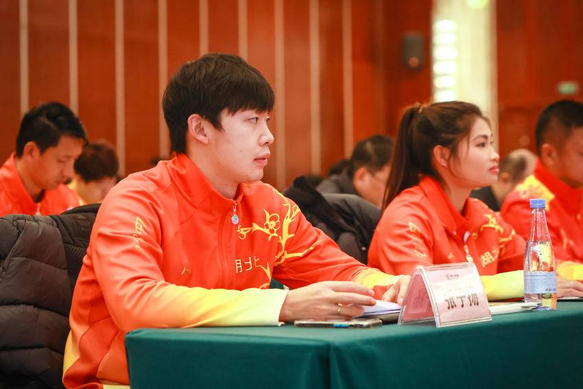 游泳运动员张子扬(左)和田径运动员李贺(右)聆听会议报告。