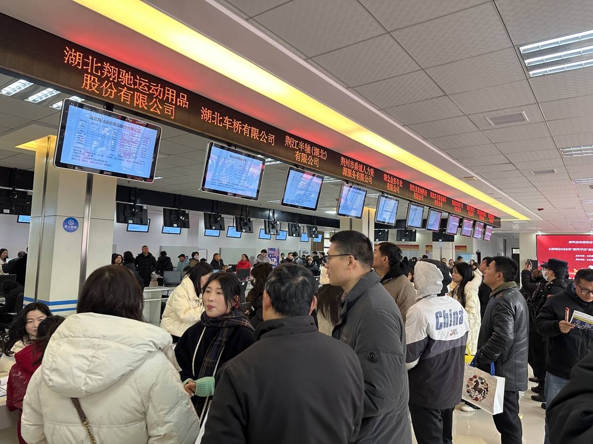 冬日寒意挡不住求职热情,服务大厅内氛围热烈。综合招聘专区,招聘企业咨询台前围满求职人员。电子屏幕上,招工企业信息、薪资待遇、福利保障等一目了然,吸引众多求职者驻足咨询、现场洽谈。