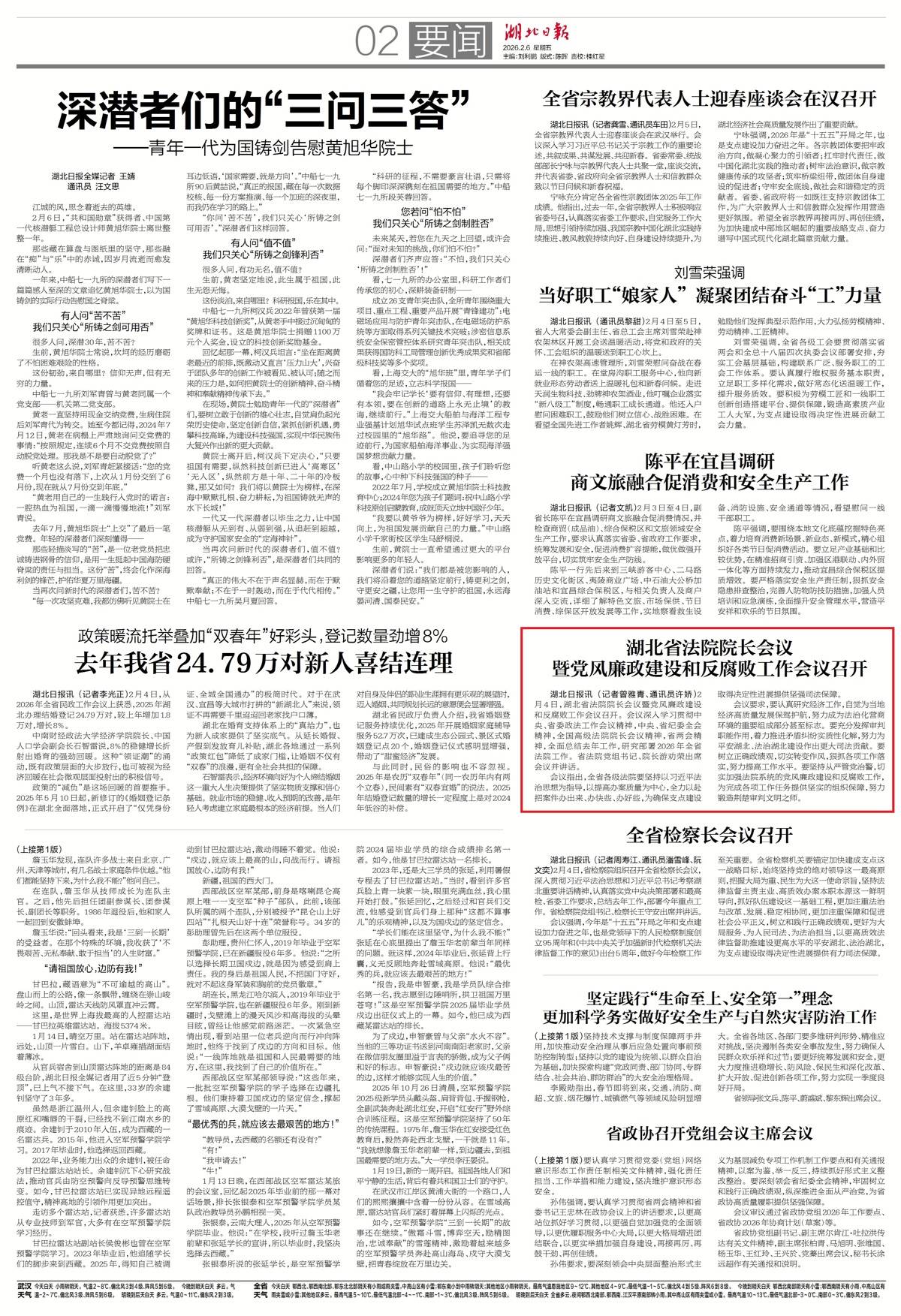 湖北日报讯(记者曾雅青、通讯员许娇)2月4日,湖北省法院院长会议暨党风廉政建设和反腐败工作会议召开。会议深入学习贯彻中央、省委政法工作会议精神,中央、省纪委全会精神,全国高级法院院长会议精神,省两会精神,全面总结去年工作,研究部署2026年全省法院工作。省法院党组书记、院长游劝荣出席会议并讲话。