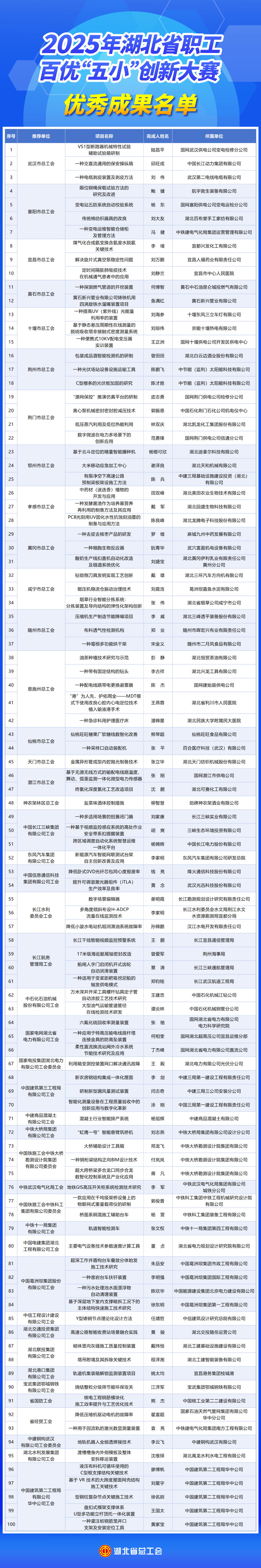 近年来,湖北省总工会将全省职工百优“五小”创新大赛作为重要抓手,带领各级工会构建起多层次、全覆盖的创新培育体系,推动活动深入企业、扎根班组。各地各级工会积极响应,形成了各具特色的推进模式。襄阳市总工会打造“大赛引领+工作室孵化+基层联动”立体体系,每年涌现近万项“五小”成果,转化率超90%;宜昌市总工会实施“竞赛发动+工作室培育”双轮驱动协同机制,通过创新工作室及联盟攻克技术难题1842项,创造经济效益近60亿元;黄石市总工会构建“赛事平台+基层网络+激励机制”三位一体工作网,将“五小”优秀成果完成人纳入“东楚工匠”培育序列,为一线技术工人搭建技能进阶、价值彰显的成长通道;国网湖北省电力有限公司工会以职工技术创新“四比四赛”为载体,常态化开展职工“五小”活动,2025年仅8项职工成果的累计订单就达5200余万元。