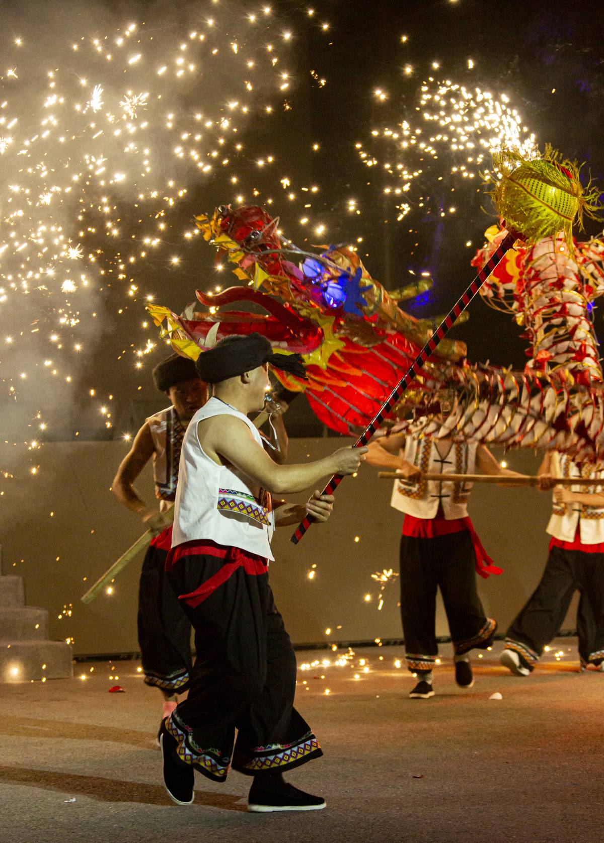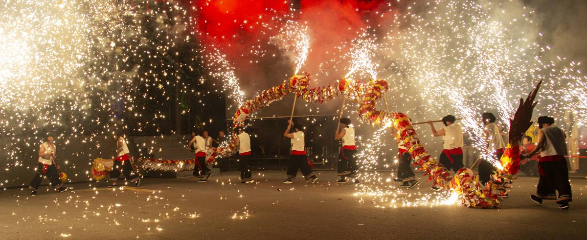 表演环节同样独具特色。“扫瘟巡游”时,龙队沿村镇行进,舞龙人挥动龙身,完成翻滚、喷水、沉海底、跳跃等动作。龙身时而呈S形翻滚,时而左斜舞出、右斜推进,或绕圈盘旋,寓意扫除街巷瘟瘴之气。高潮在于“烧瘟”:点燃花筒与蓝烟,朝龙珠、龙体及舞龙人喷射火花。舞龙人顶着漫天星火,高举龙节棒完成“火龙戏珠”“火龙漫游”“龙头钻节”等十余种高难度动作。现场星火如瀑,在夜色中划出赤色光流,蓝烟缭绕其间,视觉震撼强烈,更寓意“越烧越发,越烧越旺”。