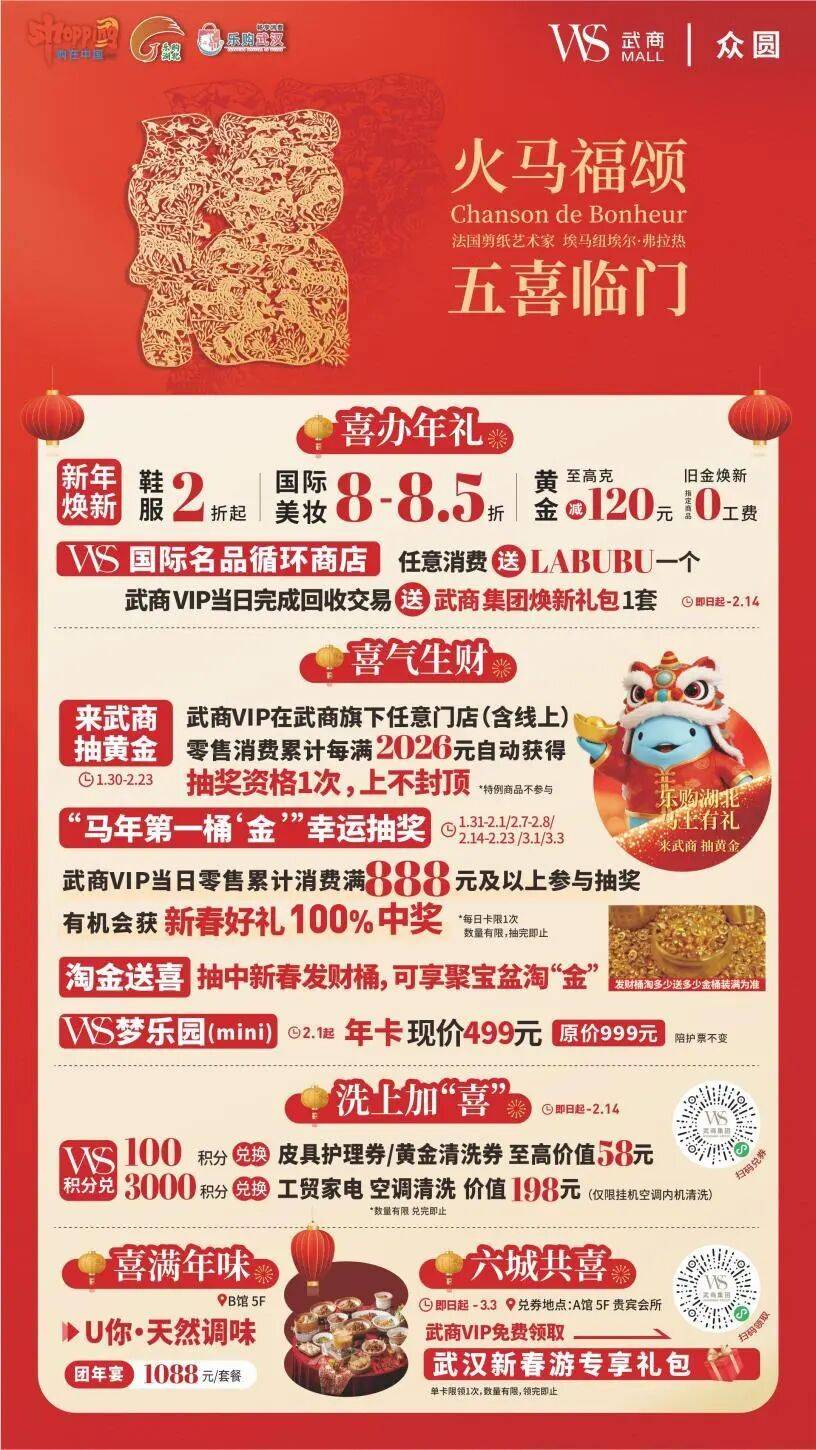 作为2026武汉新春消费季青山专场的举办地,武商MALL·众圆以“火马福颂,五喜临门”为主题,打造了一场兼具规模与品质的新春盛会,成为您春节打卡的首选之地。
