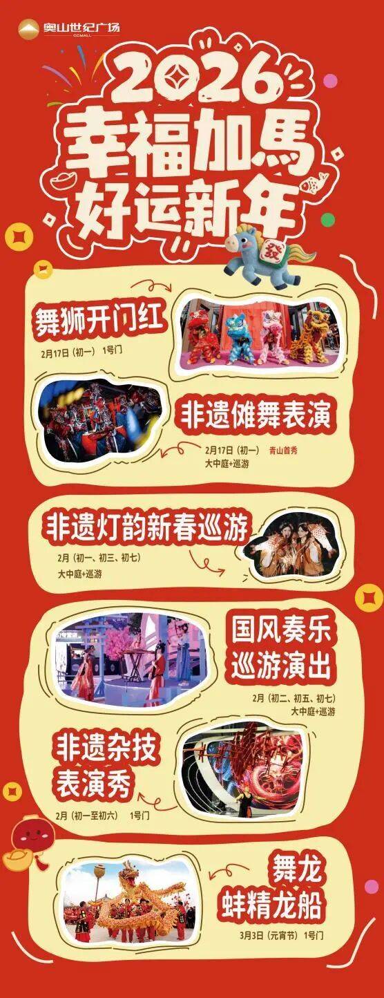 为更好满足市民群众节日期间购物、休闲、文化体验和家庭团聚等多元需求,春节期间青山区各商场联动发力,推出一系列有年味、有温度、有参与感的节日活动。陪大家一起,把年过得热热闹闹、红红火火!