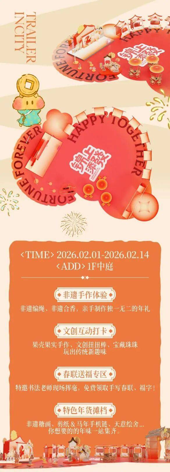 其中,中庭年货市集,设置文创互动、非遗手作体验等活动,进一步丰富休闲选择,助您把年味搬回家!期待您和孩子一起参加!