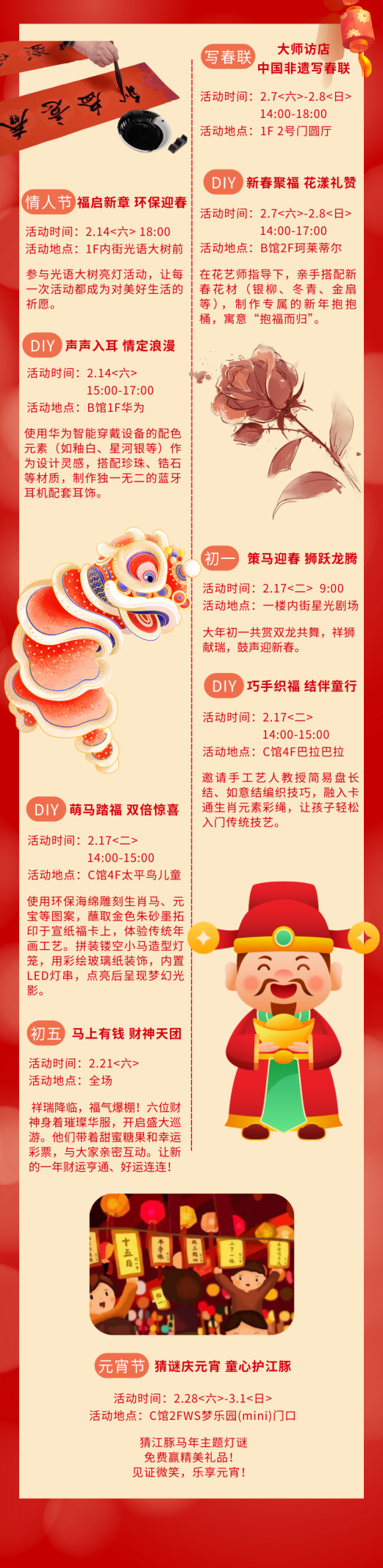商场推出马力全开·年货市集活动,包含翰墨迎春书写春联福字帖、新中式相框字画摆件、国风古韵喜庆灯笼、新年好运红袜、浪漫自助鲜花、香甜爆米花等多种好物摊位,打造更丰富的年货市集体验,助力您马年“马力全开”!