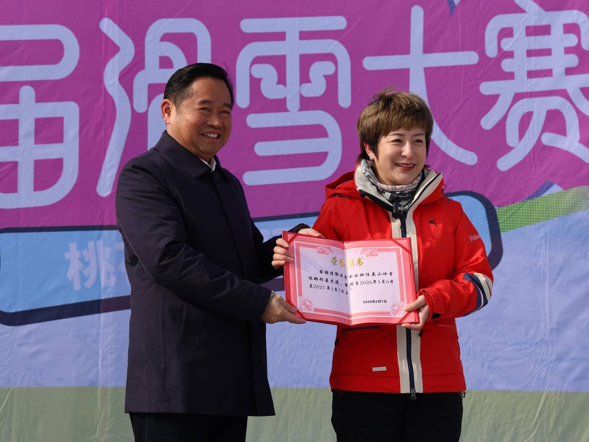英山县委书记郑光文为郭丹丹(红衣者)颁发“英山冰雪运动推广大使”证书。(湖北日报全媒记者刘毅摄)