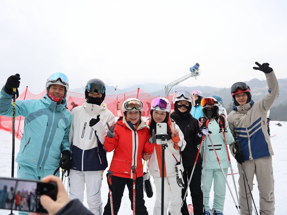 郭丹丹(红衣者)与雪友合影。(湖北日报全媒记者刘毅摄)